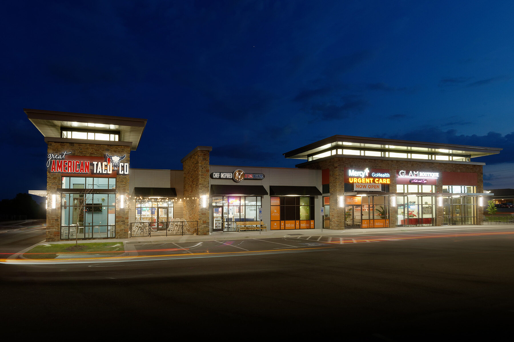 The mixed use development is the first of its kind in the growing and busy area of southwest Springfield, Missouri, offering over 42,000 square feet of retail, office and restaurant space. The mixed materials create a dynamic building aesthetic and help to differentiate tenants. George Lopez Construction Group completed tenant infills to gray box and completed the infill of Mercy Go Health.
