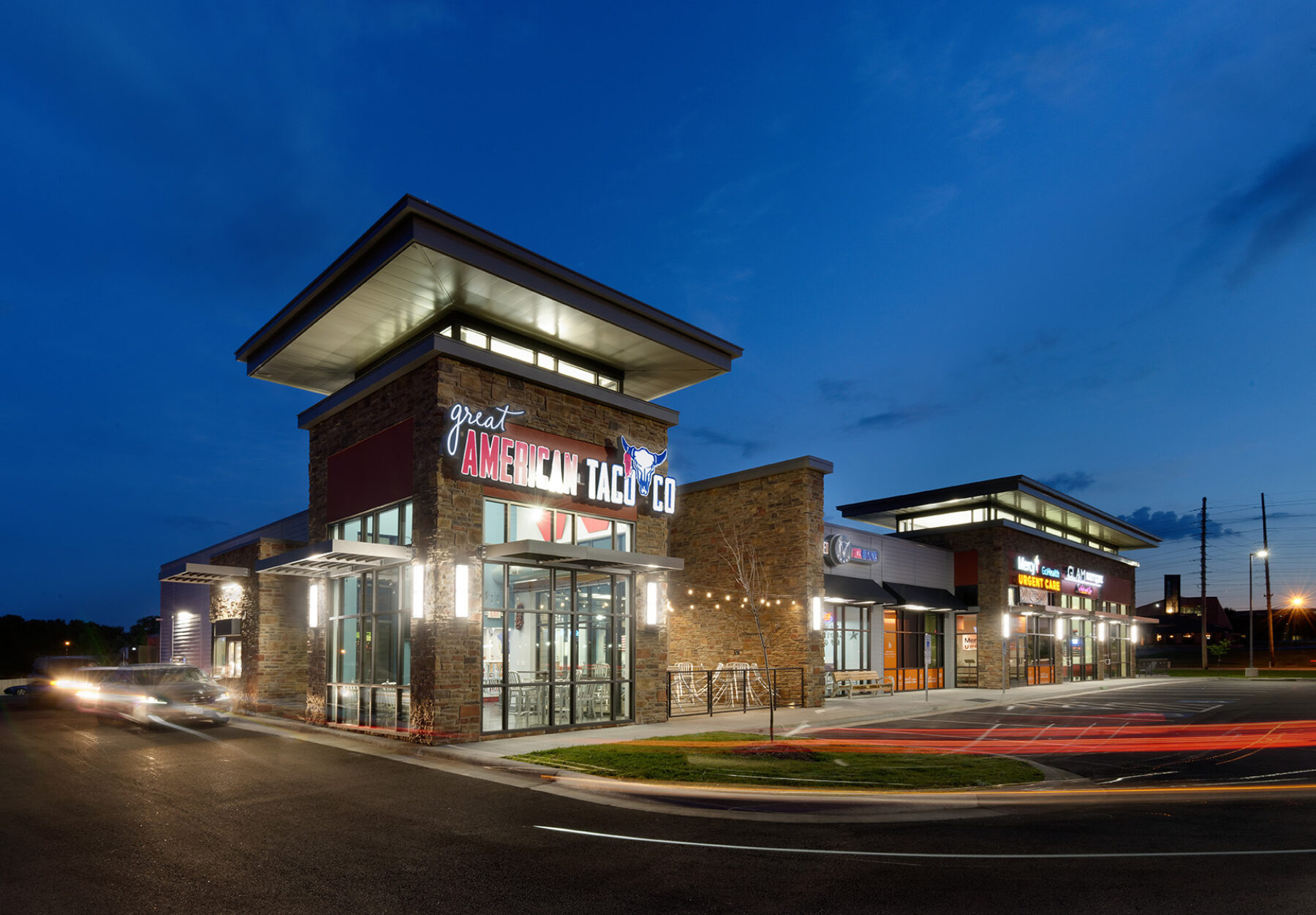 The mixed use development is the first of its kind in the growing and busy area of southwest Springfield, Missouri, offering over 42,000 square feet of retail, office and restaurant space. The mixed materials create a dynamic building aesthetic and help to differentiate tenants. George Lopez Construction Group completed tenant infills to gray box and completed the infill of Mercy Go Health.