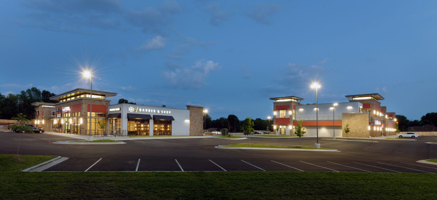 The two-story, two-building development features ten retail storefronts, ten offices, and seven restaurants. George Lopez Construction Group served as a Springfield-based general contracting company.